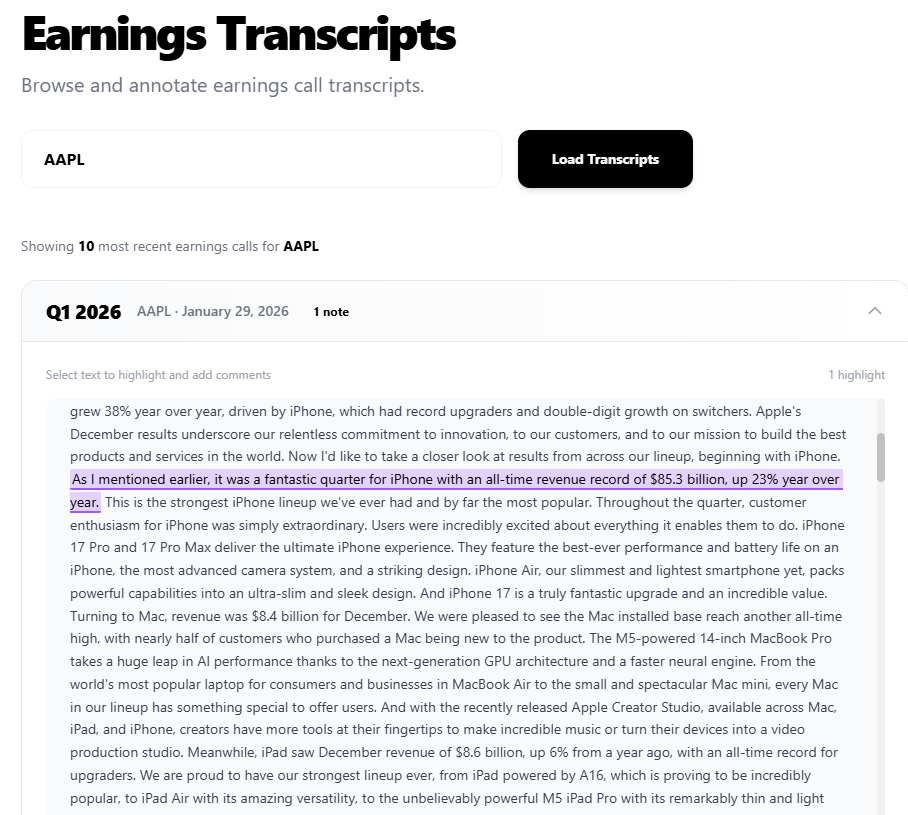 Full earnings call transcripts and financial data. Research like a Wall Street analyst — without the overhead.